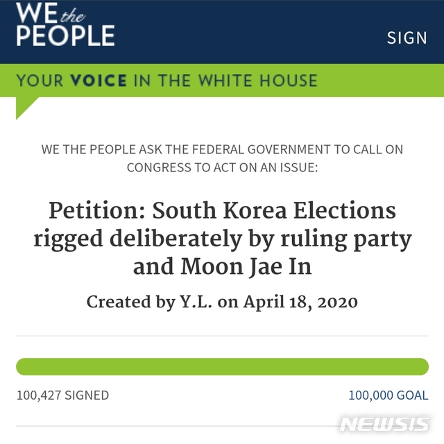 지난달 15일 치러진 대한민국 제21대 국회의원 선거(총선)에서 조작이 이뤄졌다고 일부가 의혹을 제기하는 가운데, 지난달 18일 미국 백악관 사이트에 등록된 '선거 조작 의혹 규명' 청원글에 참여한 인원이 게시 약 20일 만에 10만명을 넘어섰다.
