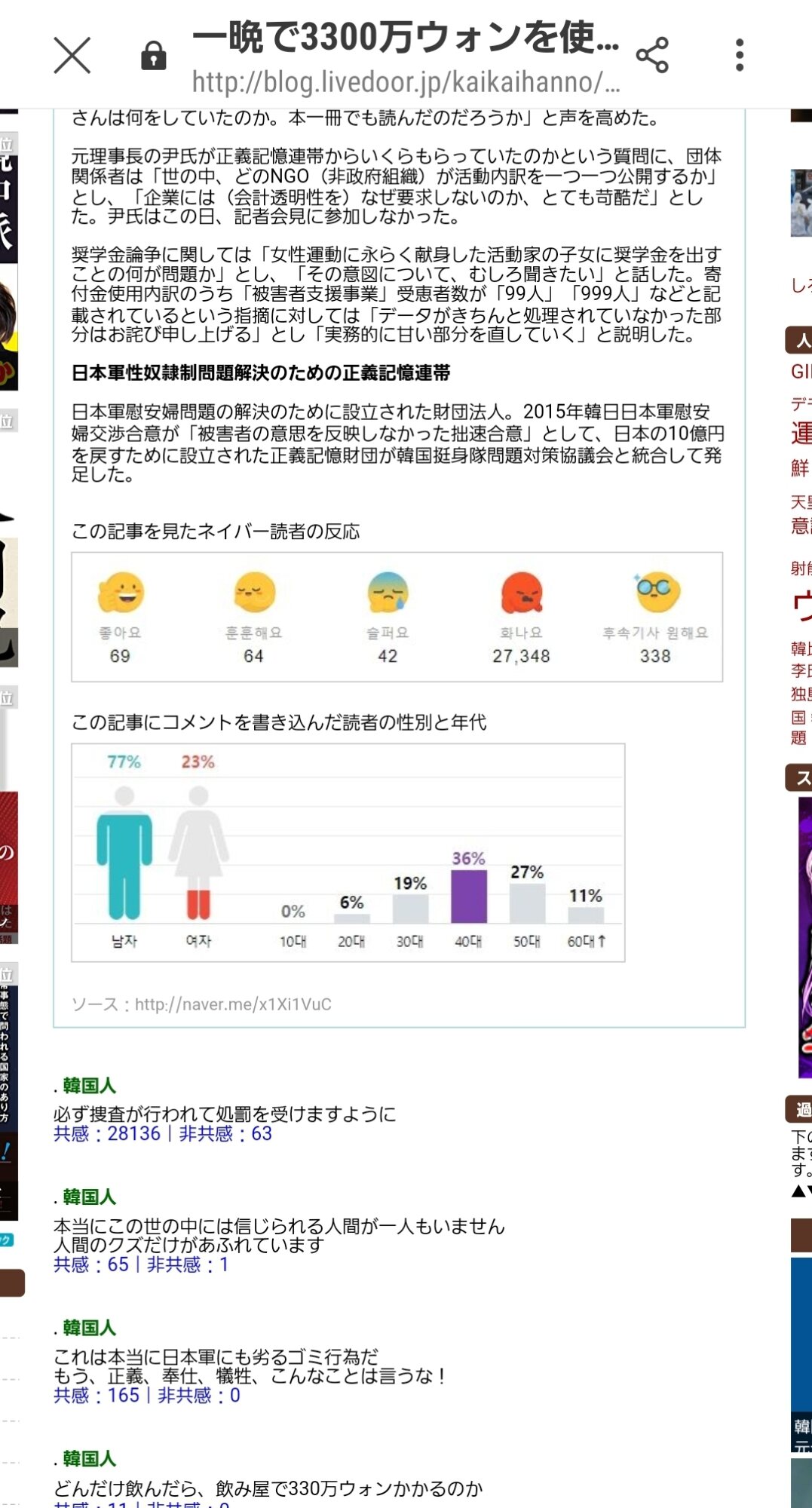 一般韓国人はしきりに善良なふりをして挺対協を責めているが、根底にあるのは正義感ではなく「お前らばっかり美味しい思いをしやがって」という妬みであるwwwwww資金使用の内訳を完全に公開してほしいな。