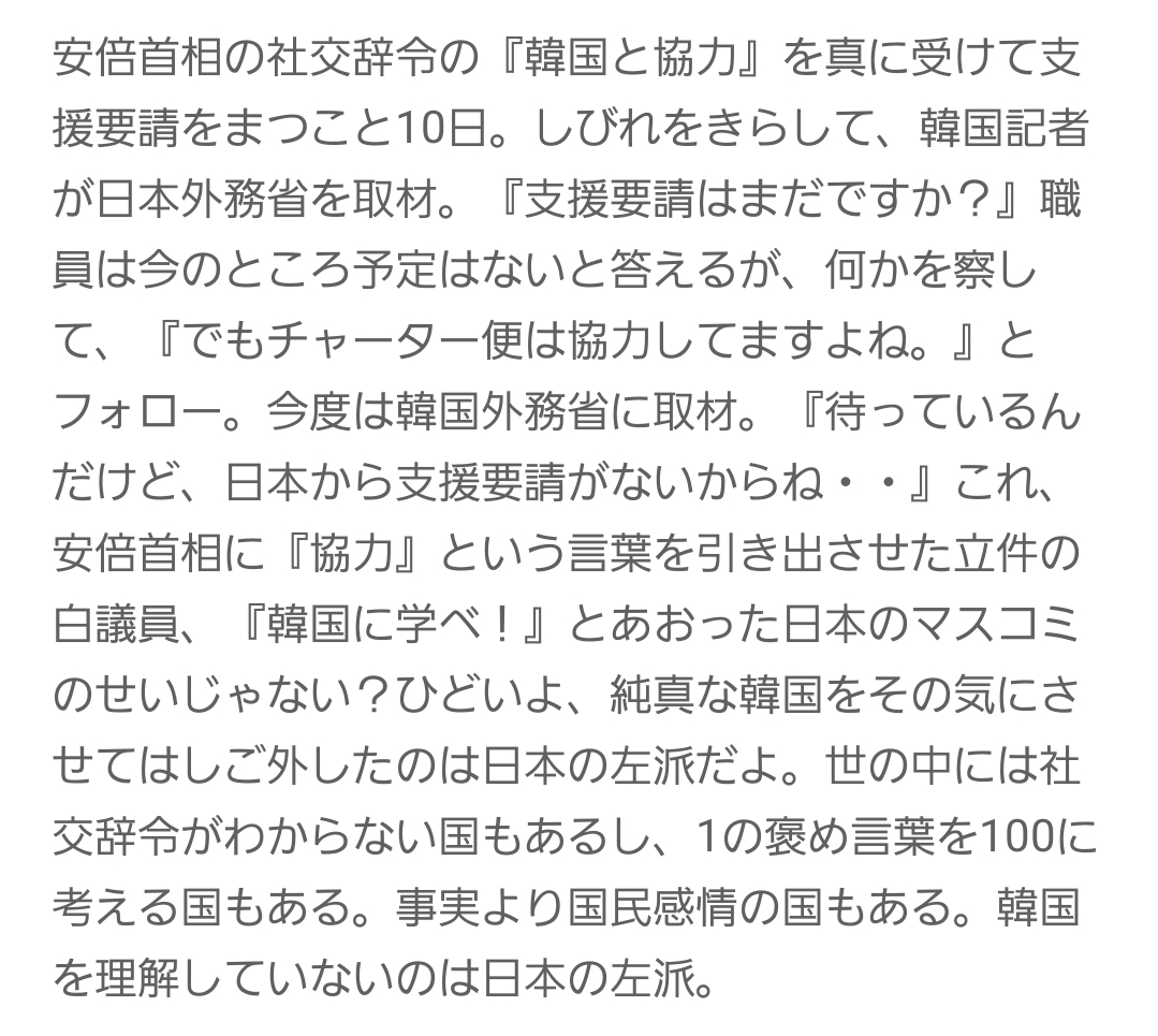 それがいつものように朝鮮人内でのホルホル回路によるフィードバック効果で増幅され「チョッパリどもがウリナラに援助を求めてきたニダ!」と変化したらしい。(´・ω・`)つ☆))Д´>aigo!