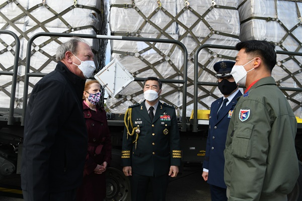 주미 한국대사관은 "우리 군 수송기를 통해 50만장의 KF94 마스크가 미 앤드루스 공군기지에 도착했다"며 "공군기지에서 마스크 전달식이 열려 미 정부인사와 참전용사들이 참석했다"고 밝혔다.