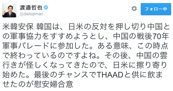 それから日本は今まで韓国というあまり使えない盾を有効に活用してきたわけで、今後も韓国を盾として使うつもりでいろいろ施してやってきたわけだが、お前ら韓国人が勝手に中国に擦り寄ってアメリカからたたかれてるだけだぞ。