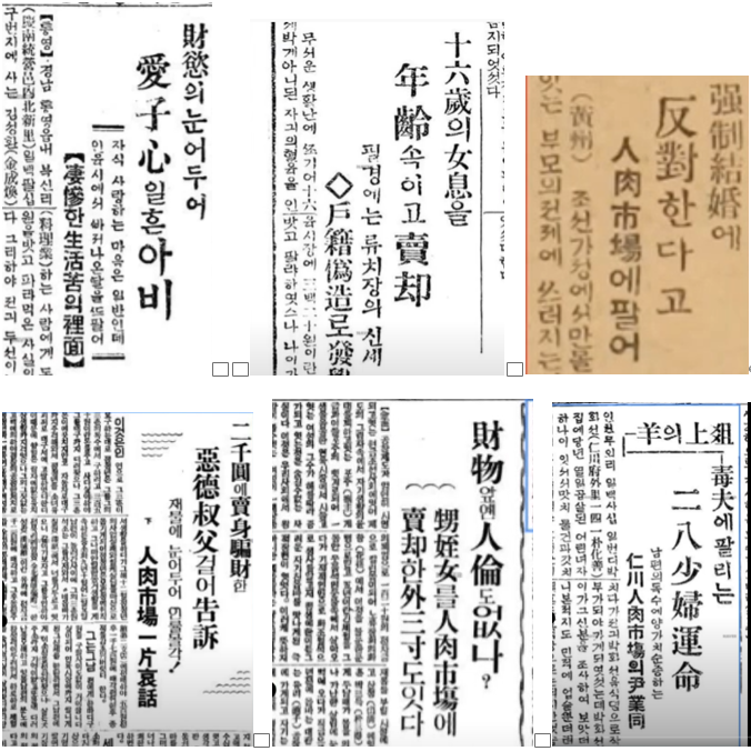 母親が息子と示し合わせて娘を三百円で売り、(東亜日報1925)、父と父の兄弟がそれぞれの娘を一緒に売った。「一金八十円が処女一生の代価、魔窟に淪落する農村処女たち」(毎日新報1928)