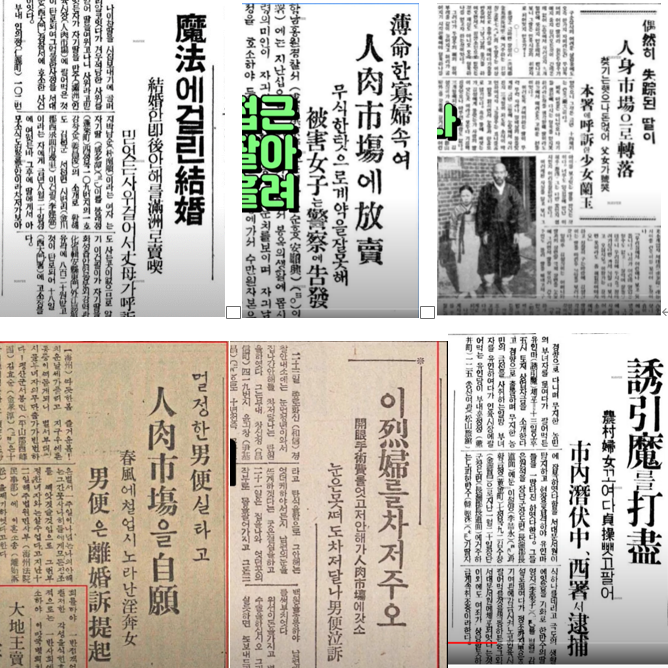 妻を中国天津に売り、妻を訪ねてきた妹は北海道に売った。妻の友達と少し同居してから蔚山に売り払った悪魔もいた。「結婚を憑籍して処女を誘引売喫 毒牙にかかった農村処女ばかり3名 釜山署で厳重取調」(毎日新報1937)
