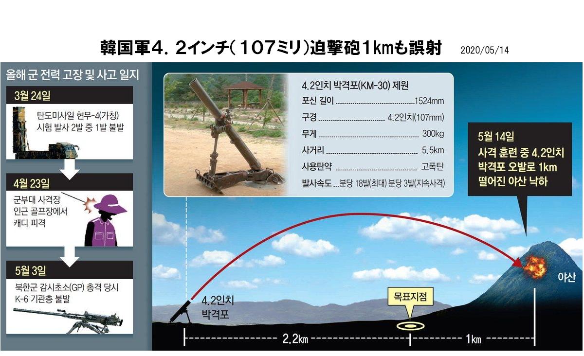 主力の4.2インチ(107ミリ)迫撃砲の実射撃訓練で、砲弾が弾着点より1キロも離れた所に落下する誤射事故が発生していたことが明らかになった。北朝鮮軍の銃撃を受けた監視所(GP)に配備されたK-6機関銃の故障放置に続き、軍の主力迫撃砲の訓練でも軍紀の緩みが露呈したと批判が起こっている。
