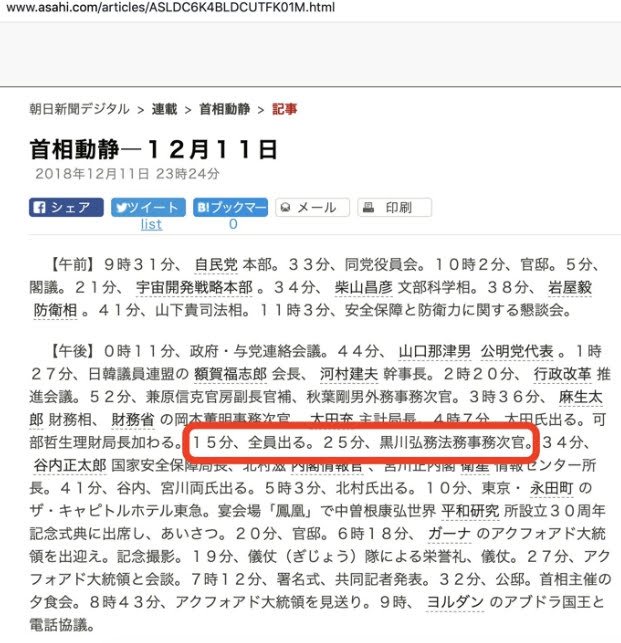 しかし朝日新聞社の2018年12月11日の首相動静では、同日16時25分から黒川弘務法務事務次官と2人きりで会っていたことが記録されています。