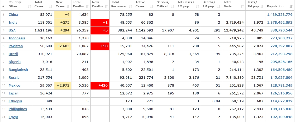 最初の画像は新型コロナの情報を人口順に並べ替え、1億人以上のデータを抽出したもの。犠牲者数が最大のアメリカと SARS の最初の発見国、中国を比較した場合、97倍もの差がある。それだけを見ればそういう仮説もあるかもしれない。次に最大(アメリカ)と最小(エチオピア)を比較すると7200倍ほどになる。検査数に差があるが中国の検査数がわからないのでとりあえず無視する。これって SARS を持ち出す必要があるのかな?免疫系は未知の部分が多すぎる。特にアフリカは他とは比較でないほどの本質的な差があると感じている。
