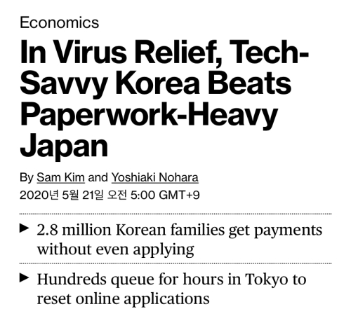 1名無し2020/05/21(Thu) 11:41:39ID:c4MjY1NTY(1/2)NG報告https://www.bnnbloomberg.ca/in-virus-relief-tech-savvy-korea-beats-paperwork-heavy-japan-1.1439066기술력의 한국낡은 인프라의 일본 이제 이것이 세계의 상식이 되었다.>>5>>6>>8>>10>>11>>16>>34>>45>>50>>51>>65>>67>>90>>96>>100>>102>>112>>120>>123>>127>>163>>167>>170>>189>>190>>191>>199>>206>>227>>229>>232>>2422