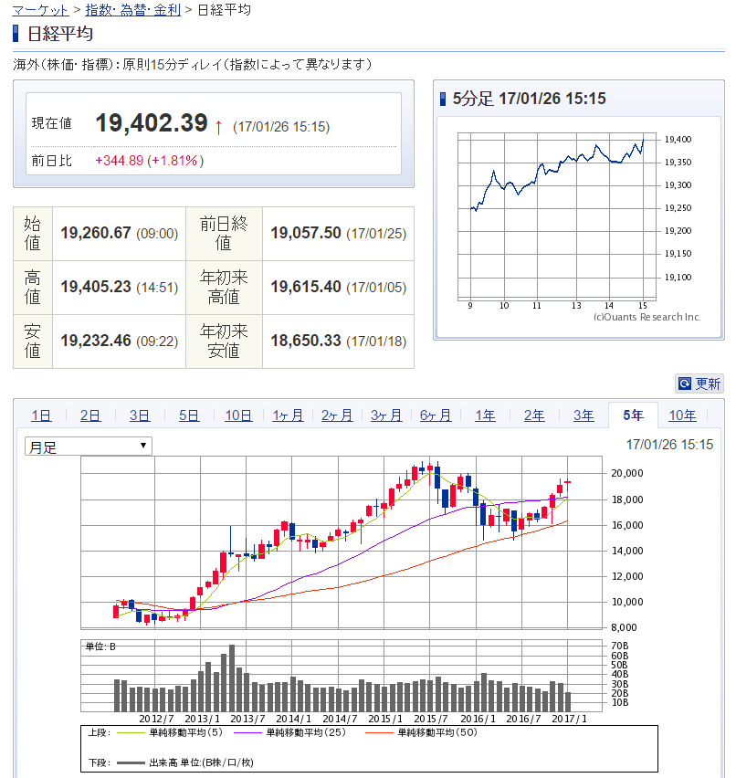 この5年間の日経平均株価の月足チャートを見てもアベノミクスで