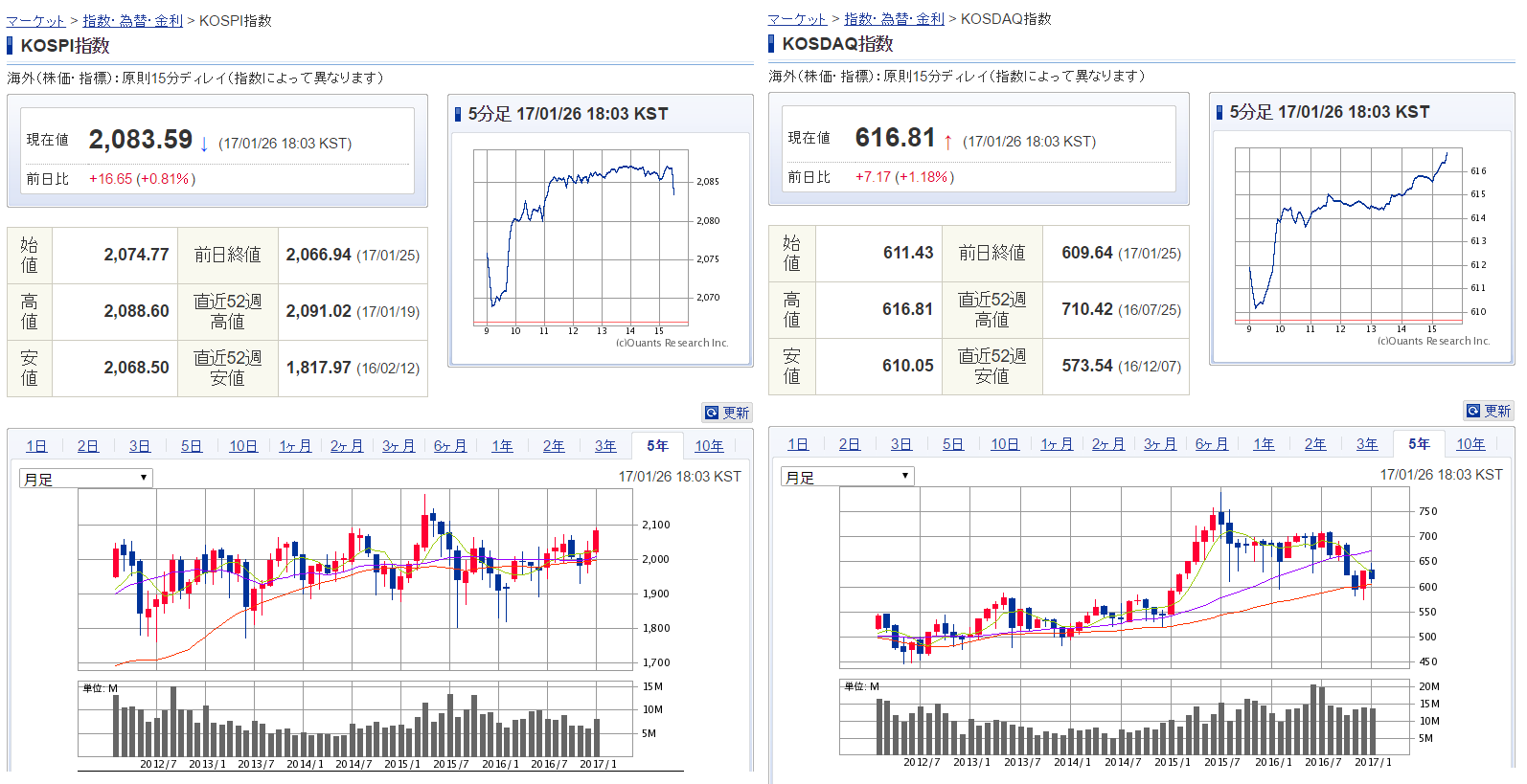 アメリカでもトヨタだけで13万人以上を雇用している。KOSPIとKOSDAQの5年間の月足チャート。