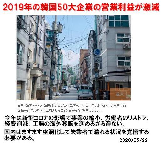 これについて韓国ネットからは「コロナ以前前から韓国経済は危機的状況に陥っていたということ」【韓国経済】 2019年の韓国50大企業の営業利益が半分以下に激減! 2020/05/22