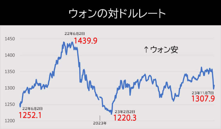 その結果、ウォン防衛のための弾薬庫である外貨準備は2021年10月の4692億ドルをピークに減り始めました。2年後の2023年10月には4129億ドルと12%も減少しました。外準の減少自体が市場での新たなウォン売りを呼びます。韓国の通貨防衛能力がそれだけ落ちたことを意味するからです。