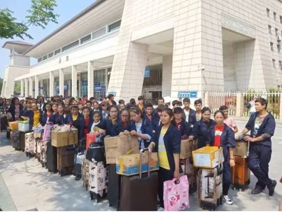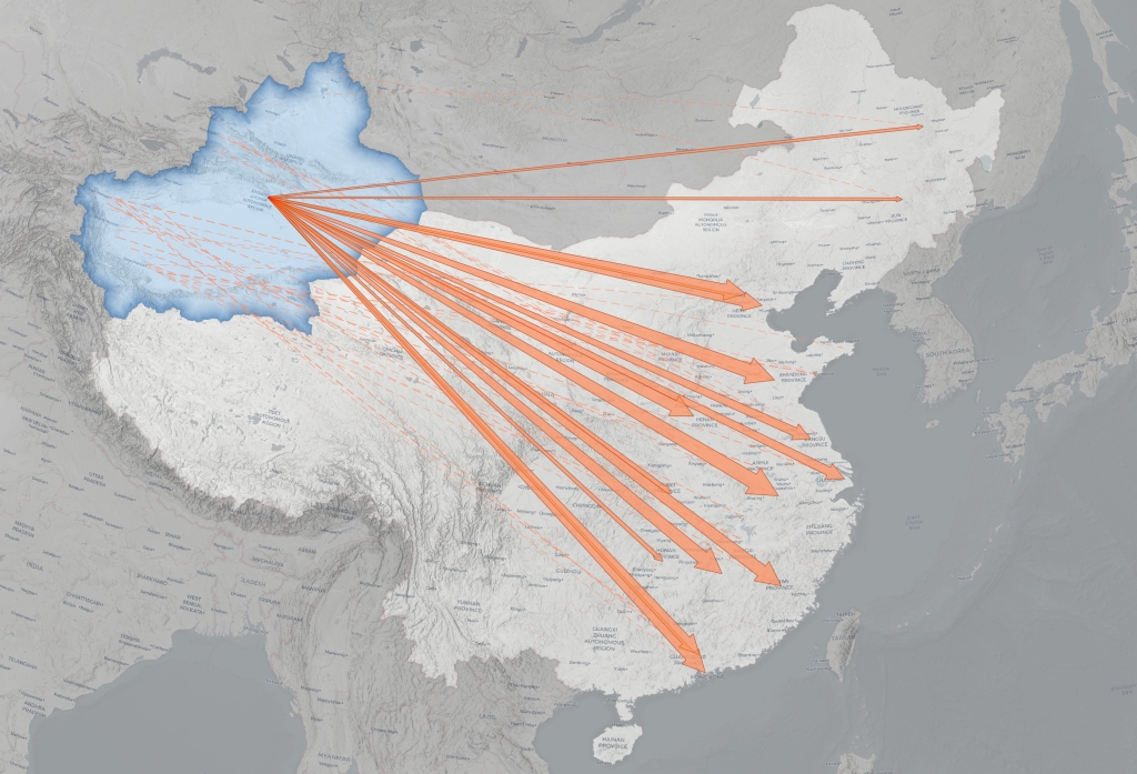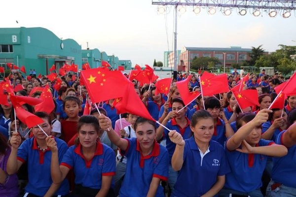 「教育プログラム」にて、中国の旗を振っているウイグル人労働者