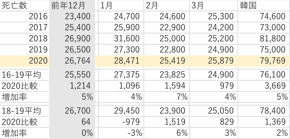 韓国はどうなんだろね?日本は例年比較1~3月の超過死亡者は発生せず
