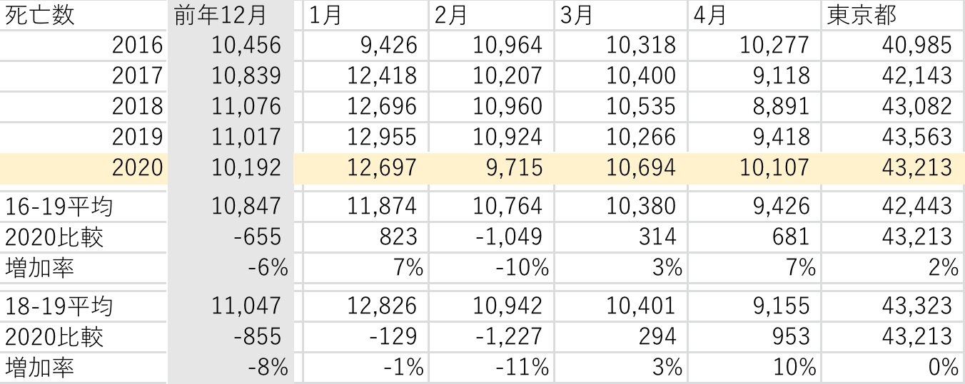 ちらっと見ただけだけど、これのどこに、今年の4月の東京都の死亡者数が載っているの?聞いたところで真実は答えないだろう。