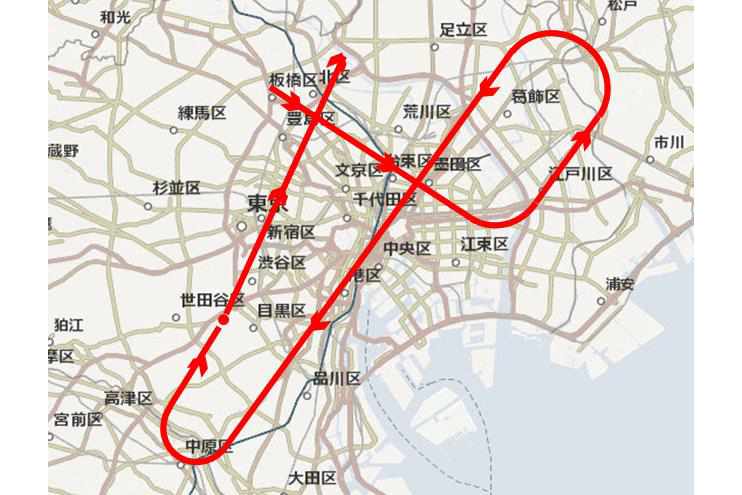 時間は12時40分頃~13時頃の間。飛行ルートは、東京都区部を中心に編隊による航過飛行を行う。
