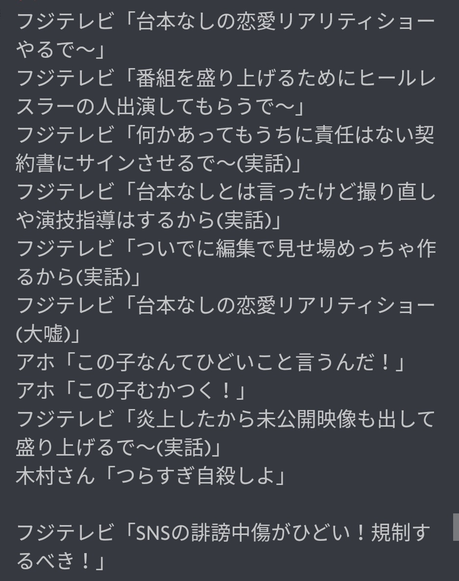 学生プロレスレベルの薄っぺらなショーをガチだと思い込みヒールを叩く連中も頭がどうかしているか、こんな低俗なショーをドキュメンタリー風に作り、公共の電波で放送する方も悪質だよな。
