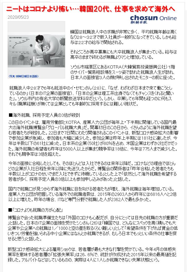 【韓国経済】 ニートはコロナより怖い…韓国20代、仕事を求めて海外へ 2020/05/23