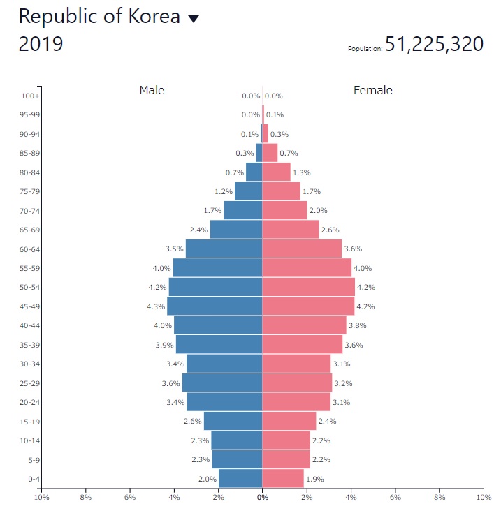 2010年時点で、韓国はOECD34か国(当時)のうち、高齢化率は30位の「非常に若い国」だった。総人口のうち75%程度が生産年齢人口で、稼働率の良い国だったのだ。しかし、急速に高齢化が進んでいて、2034年ごろには「2020年の日本と同じレベルの高齢化社会」となる。人口ボーナスは、終わりつつあるのだ。