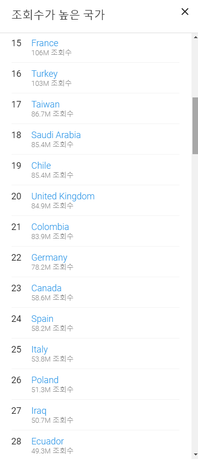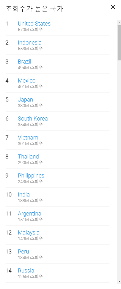 BTSのyoutube国別アクセス数TOP 20(最近12ヶ月)