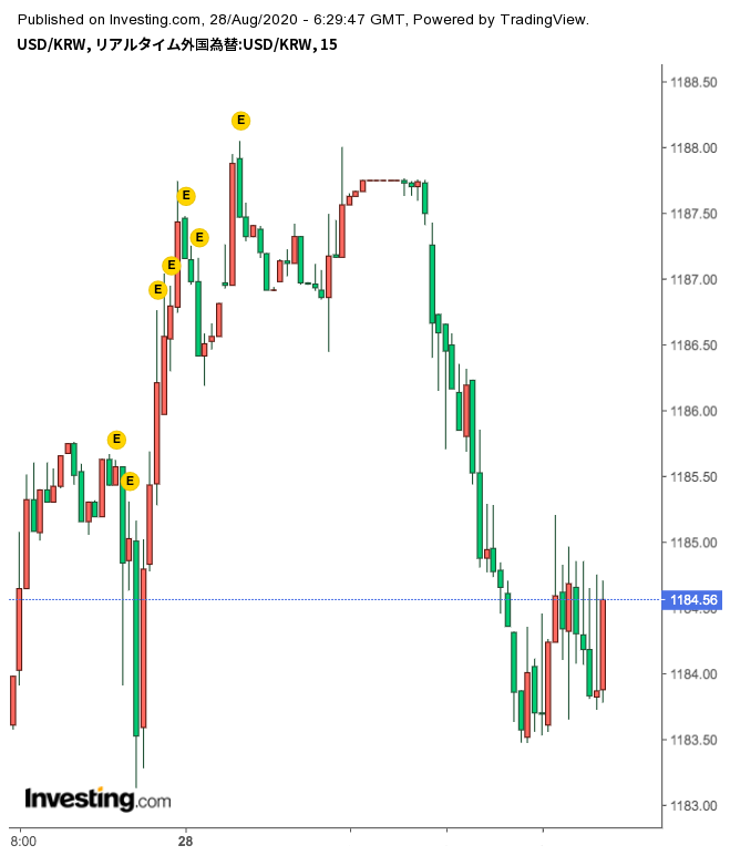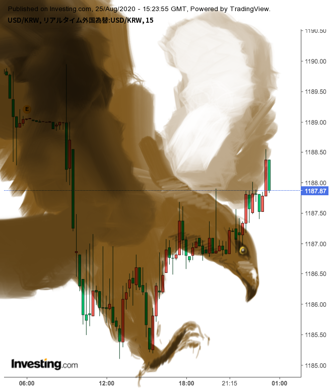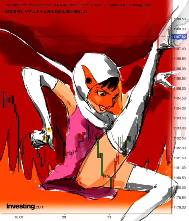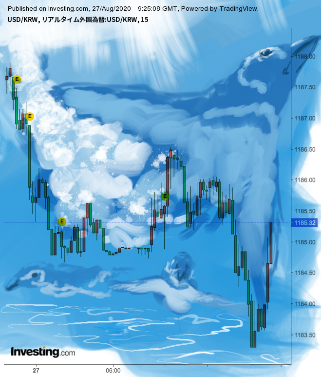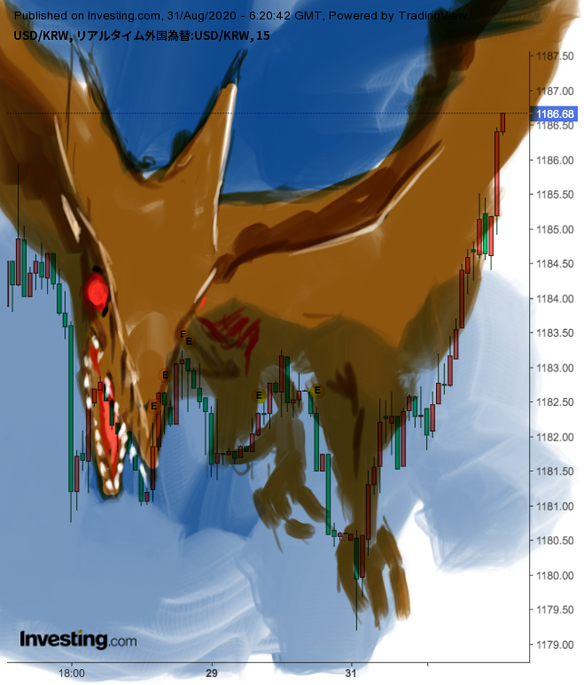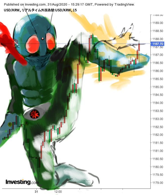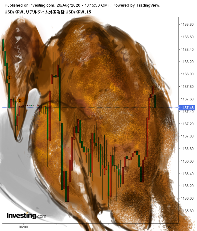 ウォンは韓国市場で買われ、米国市場で売られるパターンが続くね、1180~1190間で動かないね。