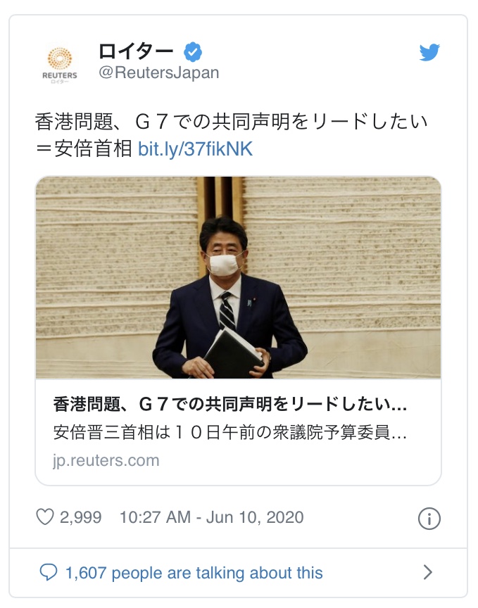 共同通信が6日に配信した、「日本、中国批判に参加拒否」「香港安全法巡る共同声明」「習主席訪日実現へ配慮か」「欧米諸国から失望の声」との見出しが付いた記事について、菅義偉官房長官は8日の記者会見で「米国や英国などの関係国は、わが国の対応を評価しており、『失望の声が伝えられる』という事実はない」などと否定的見解を示した。