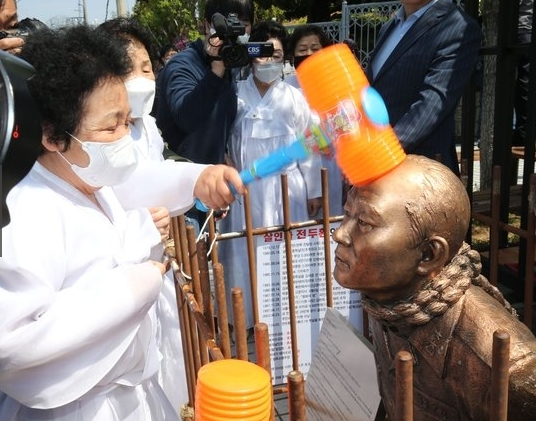 当初、この銅像は昨年12月12日、12・12軍事反乱40周年を迎えてソウル光化門(クァンファムン)広場に設置され市民によって壊された。その後、5・18団体は4月27日破損した銅像を修理して光州に移した。故チョ・ビオ神父の名誉を傷つけた容疑でこの日裁判に出席した全元大統領に対する拘束を促すためだ。全元大統領は2017年4月自身の回顧録を通じて「チョ神父は破廉恥な嘘つき」と主張して起訴された。
