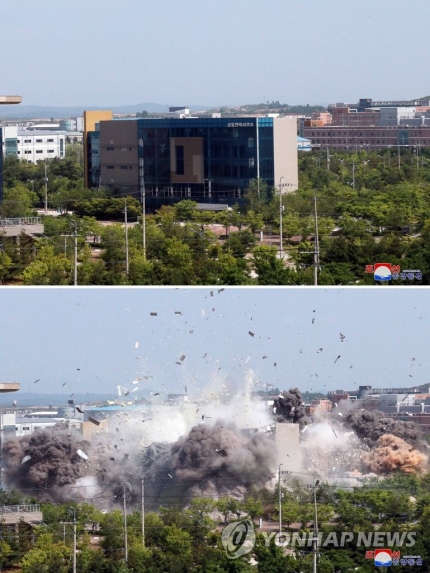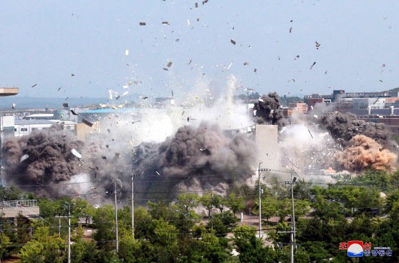 北朝鮮の朝鮮中央テレビは17日午後、南西部・開城の南北共同連絡事務所を前日に爆破した際の映像を公開した。映像は30秒余りで、ごう音とともに破片を飛ばしながら崩壊する連絡事務所の様子が収められている。日本の真似して、空母やら潜水艦を建造する金を、