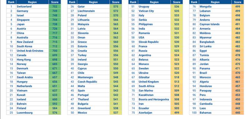 最も安全な国とされたのはスイスで、後にはドイツ、イスラエル、シンガポール、日本、オーストリア、中国、豪州、ニュージーランド、韓国が続いた。その他、上位20位の第1グループには、アラブ首長国連邦、カナダ、ノルウェー、デンマークなどが含まれたという。