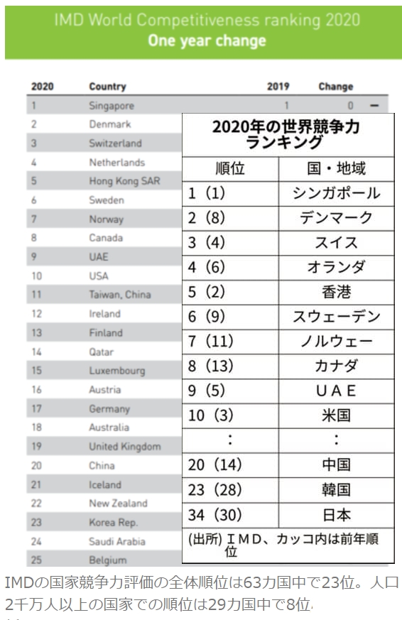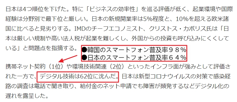 携帯ネット契約(1位)や環境技術関連(2位)といったインフラ面が強みとして評価された一方で、デジタル技術は62位に沈んだ。日本は新型コロナウイルスの対策で感染経路の調査は電話で聞き取り、給付金のネット申請でも障害が頻発するなどデジタル化の遅れを露呈した。>>1