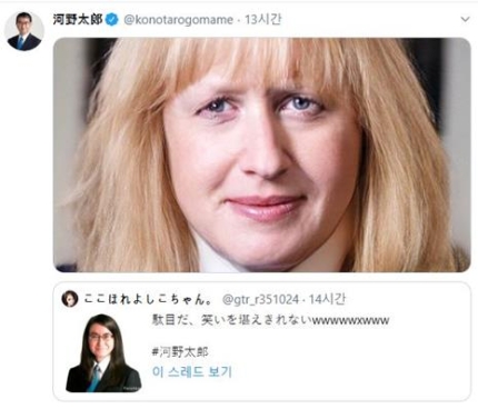 영국 총리와 자신의 ‘긴머리 합성 사진’ 올린 日 고노 방위장관