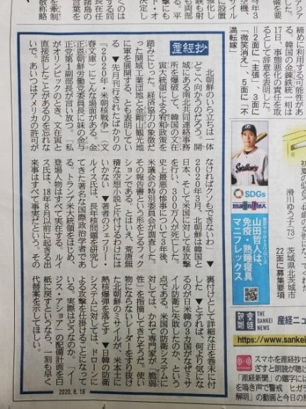 産経新聞は18日、1面の長期固定コラムである産経ショー(産経抄・「産経新聞が選んだ今日の主要なシーン」という意味)を介して、ジェフリー・ルイスミドルベリー国際学研究所、東アジア不拡散センター所長の小説「2020北米核戦争」を引用した。このコラムをそのまま紹介すると次の通りである。