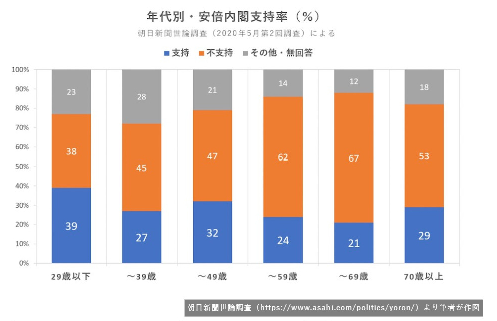 朝日新聞が実施した最新の世論調査(2020年5月第2回調査)によれば、支持29%