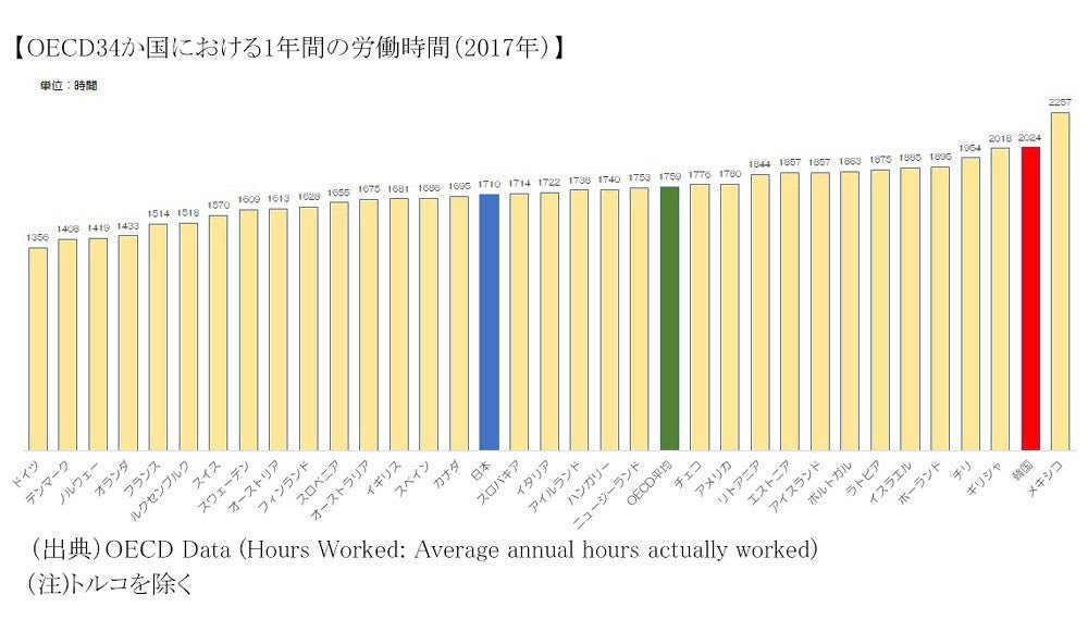 2017年の韓国の年間労働時間は2024時間で、日本は1710時間。
