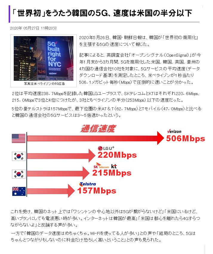 その上で、「韓国紙コリア・ヘラルドが業界関係者の話として伝えたところによると、韓国の商用5Gの通信速度は4G/LTEの3~4倍でしかなく、使用しているのは4Gと3.5ギガヘルツ(GHz)帯であり、本当の意味での5Gではない。真の5Gとは、28GHz帯のことで、その通信速度は4G/LTEの20倍に達する」と説明。「韓国サムスン電子のフラッグシップスマートフォンGalaxy S20は、5G対応と称しているが、韓国で販売されているS20は28GHz帯をサポートしていない」とした。
