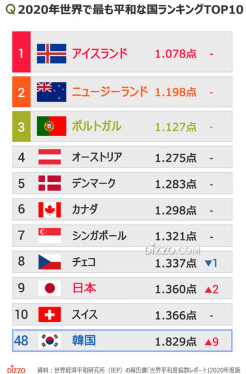 【朝鮮日報】「世界で最も平和な国」1位はアイスランド、韓国48位、日本は?