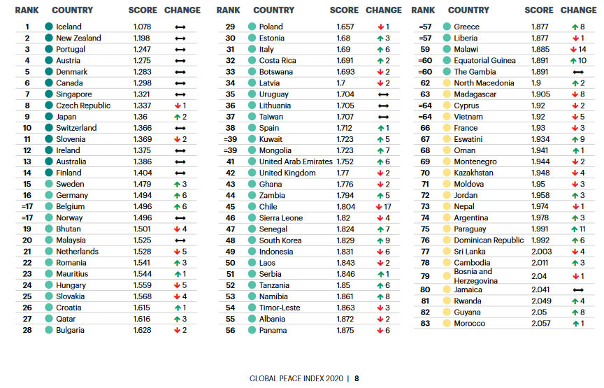 最も平和な国は1.078点を獲得したアイスランドで、2008年から1位をキープしている。以下、ニュージーランド(1.198点)、ポルトガル(1.247点)、オーストリア(1.275点)、デンマーク(1.283点)がトップ5に入った。
