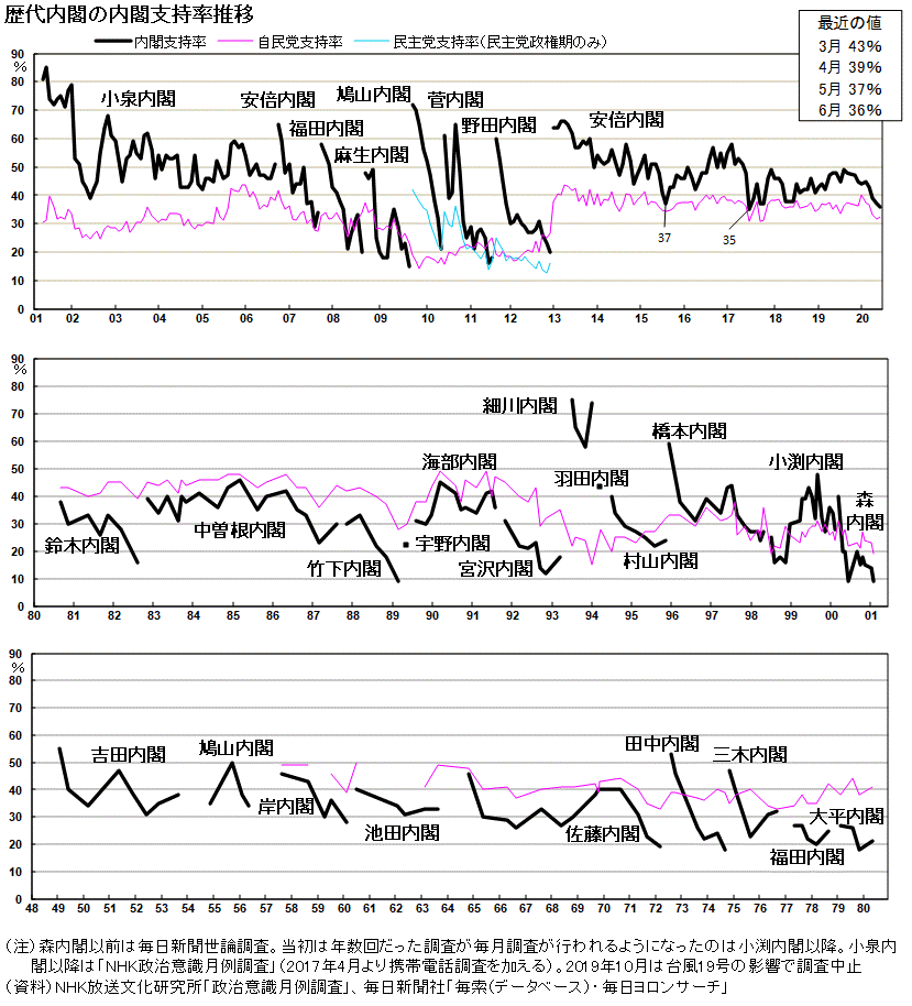 調査は従来、個別面接方式で行ってきたが、新型コロナの感染状況を踏まえて、前月に続いて郵送方式で実施。6月11日に一斉投函(とうかん)し、22日回収分をもって締め切った。対象は全国18歳以上の男女2000人で、有効回収率は49.3%だった。安倍晋三さんはもうダメですね