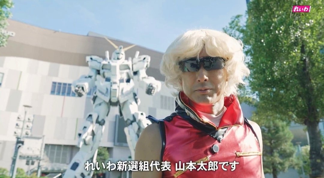 山本氏は19日、自身の公式X(旧ツイッター)や党のユーチューブ番組にガンダムのキャラクターである「クワトロ・バジーナ(シャア・アズナブル)」の赤の衣装で登場。撮影場所は東京・台場にある実物大のユニコーンガンダムの前で、同党の比例代表候補者でガンダムシリーズに声優で出演している岡本麻弥氏の応援用だった。