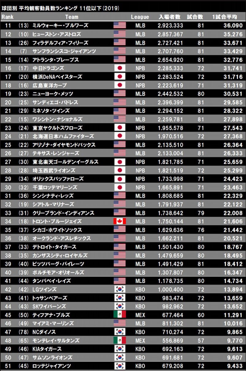 2019 世界のプロ野球 観客動員数(1試合平均)