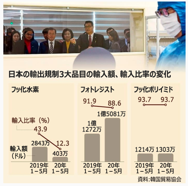 国産化が遅れている規制品目のフォトレジスト、フッ化ポリイミドは、同じ期間に輸入額がさらに増えている。特にサムスン電子がファウンドリーの超微細工程に使用するEUV(極端紫外線)フォトレジストの場合、国産化には5年程度かかるとみられている。現在東進セミケムが開発中のフォトレジストは超微細工程では使いにくいフッ化アルゴン(ArF)を光源としたものであり、当面は日本製への100%依存が続く見通しだ。>>79