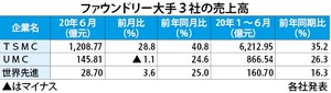 台湾ファウンドリー(半導体の受託製造)大手3社の2020年6月の連結売上高が出そろい、世界最大手の台湾積体電路製造(TSMC)は前年同月比40.8%増の1,208億7,778万台湾元(約4,370億円)だった。単月の過去最高額を更新し、3カ月ぶりに1,000億元台を回復した。前月比では28.8%増えた。
