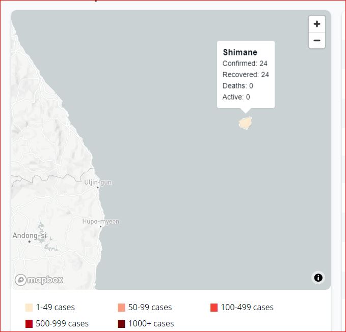 현재 이 사이트 메인 세계지도에서 한국 울릉도를 클릭하면 일본땅 'Shimanae'라고 표기하고 '확진자 24명', '회복자 24명', '사망자 0명'이라는 내용도 나온다.