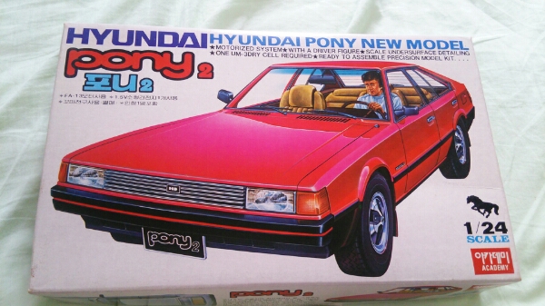 >初期の日本への輸入プラモデルには、大韓民国(以下韓国)の大衆車・現代自動車1/24ポニー2などが登場し、精巧な作り・パーツ精度は評判になったがボディー以外のシャーシ部分のパーツが、日本のタミヤ製品1/24日産・ブルーバードコピー品で付属のドライバー人形も同じ物であった。