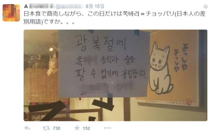 광복절에 일본인에게 음식을 팔기 싫은 일식집