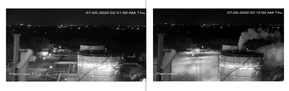 去る5月7日午前2時31分50秒に撮影されたインドのLG電子(LG)ポリマース工場の化学物質タンク市チブイ映像(左)では、珍しい点は発見されなかったが、同日午前3時15分撮影された映像で韓国映画「エグジット>のように煙(スチレンガス)が漏れ出て立ち込めに敷かれている。インドの調査委員会報告書セーブ>>27