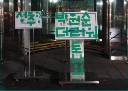 朝鮮日報や反与党系のマスコミに言えば120%尾ひれを付けて宣伝するだろう14日、ソウル市によると、同日未明、市役所の正門とソウル図書館の正門前の立て看板にテープを使って「セクハラ犯の朴元淳(パク·ウォンスン)、汚らわしい」など朴元淳市長を非難する文言が貼られているのを庁舎管理者が発見した。 警察官は午前6時ごろ、全部剥がしたが、まだ誰が付けたかは分かっていない。