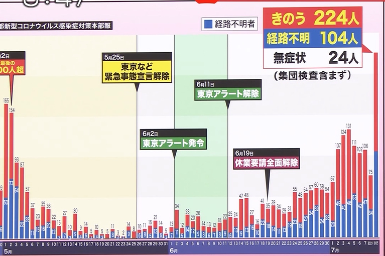 東京では9日、新たに224人の新規感染が確認された。緊急事態宣言発令中の4月17日に記録した206人を上回って、過去最多。東京都の感染者数は5月連休明け後は順調に減少し、1日当たりの新規感染確認は1桁台~50人以下で推移していた。しかし、緊急事態宣言が解除され、人の動きが活発になるにつれて感染者数は再び増加に転じ、7月2~7日まで6日間連続で100人超となっていた。9日の感染者数には、ホストクラブを対象とした集団検査による陽性者が含まれるという。