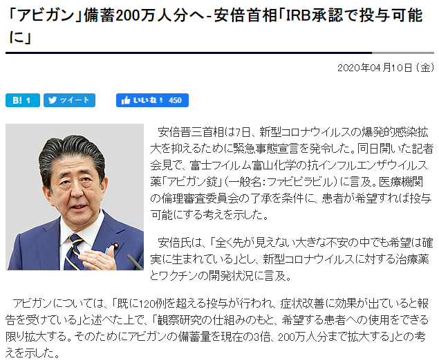 の事前キャンペーンか?。アビガンの一部パテント生産を許した国と聞く「嘘つき中国」。中国はアビガンの効果で治療したと言っているぞ。いかな嘘つき中国でもアビガンが効かなかったら、上海のデズニーランドはあんなに混雑しないだろう。さて、アビガンの薬効に関しては、厚労省が嘘つきか?、中国が嘘つきか?。