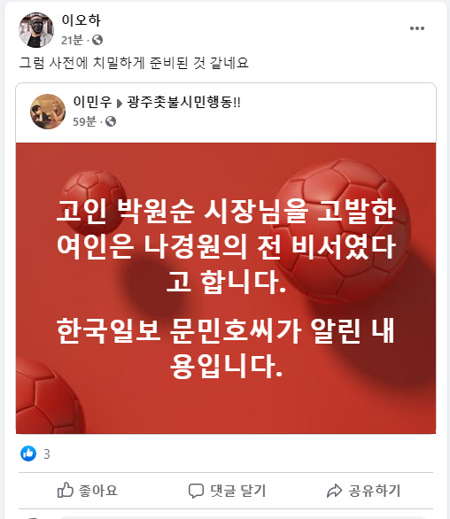 池氏は12日午前、自身のフェイスブックに"故人の朴元淳(パク・ウォンスン)市長を告発した女性は羅候補の元秘書だったとします。 韓国日報ムンミンホさんが知らせた内容です。"という文を載せた。 他の人のフェイスブック文をそのまま持って掲載したものであり、ジ氏はその上に"それでは事前に緻密に準備されたみたいですね"と書いた。