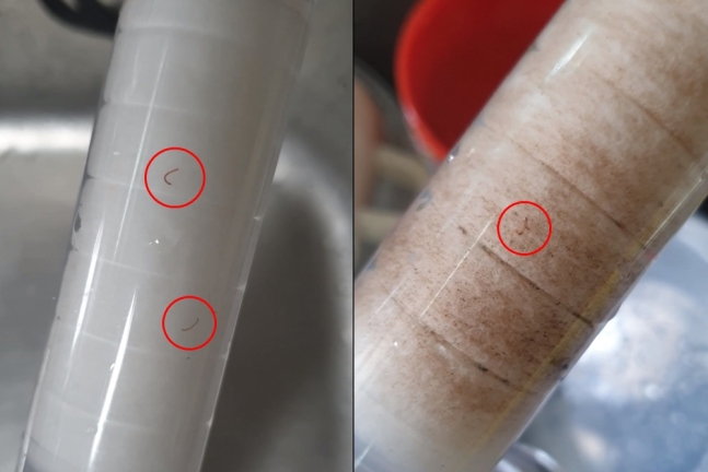 西区黔丹洞の住民だと明かした著者は11日昼、キッチンのシンク台の蛇口に設置したフィルターから細い糸のような虫を4匹発見したと動画を掲載した。 映像を見ると、長さ約1〜1.5センチの細い糸のような虫がフィルターにろ過されてうごめいている。